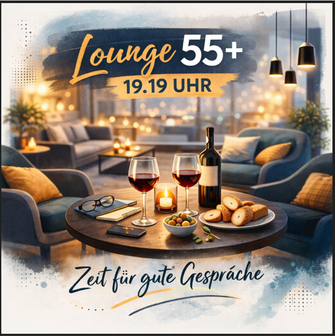 Lounge 55+19. März, 19:19 UhrDie Rente winkt oder ist bereits beantragt, die Familienphase ist abgeschlossen, die Kinder aus dem Haus. Die wilden Jahre der Jugend sind definitiv vorbei.. Vielleicht ist es Zeit, uns gemeinsam einmal darüber Gedanken zu machen, wie wir uns die verbleibende Zeit wünschen. Darüber wollen wir mit euch ins Gespräch kommen, in entspannter Lounge-Atmosphäre bei einem Glas Wein oder einem alkoholfreien Cocktail. -